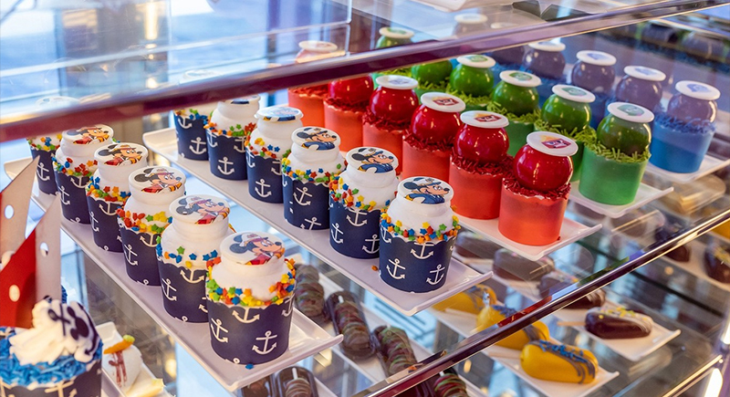 You’ll find a themed dessert shop near the buffet area on each ship, and they tend to draw attention right away with oversized character figures and detailed displays. These spaces are especially popular with kids and anyone seeking fun photo opportunities during sea days. The menus change slightly by ship, but most offer a mix of ice cream, candy, cupcakes, and other sweets for an extra charge.