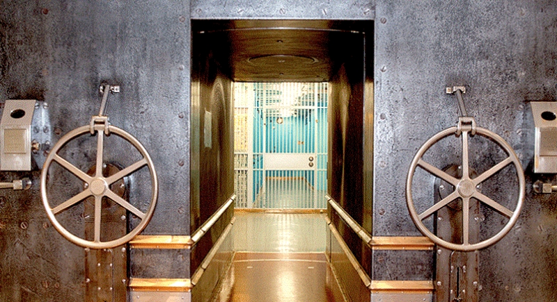 The only entrance to the vault is protected by a 90-ton steel cylinder embedded within a 140-ton steel and concrete frame. When closed, it forms an airtight and watertight seal. Once locked, steel rods are inserted, and time clocks engage, preventing entry until the next business day.