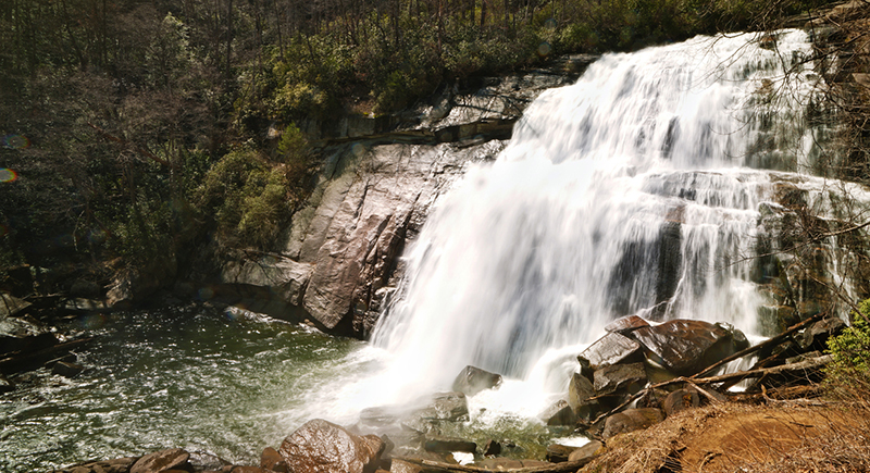 Rainbow Falls in Gorges State Park plunges 125 feet over vast granite cliffs, its mist often catching sunlight to form vivid rainbows. The 3.9-mile round-trip trail climbs steadily through dense forest and wildflowers, ending at a dramatic viewpoint where water and rock meet in a constant, thundering display.