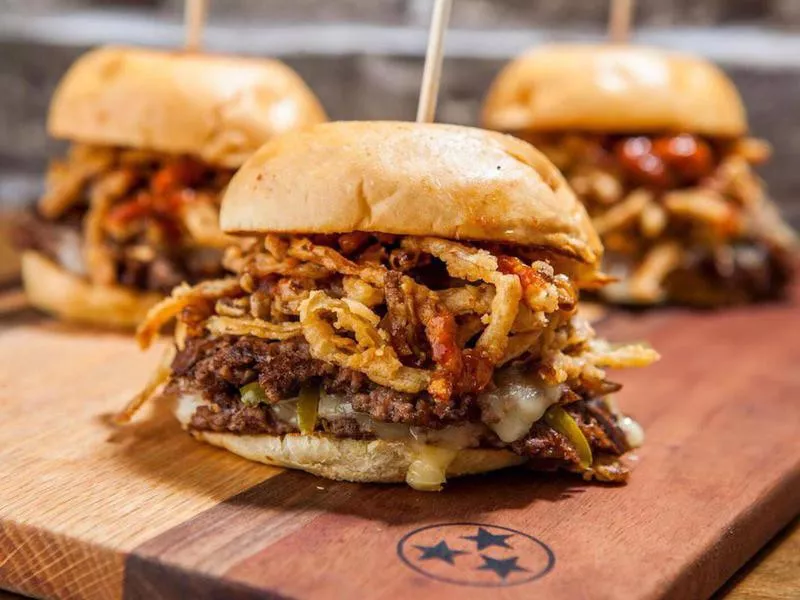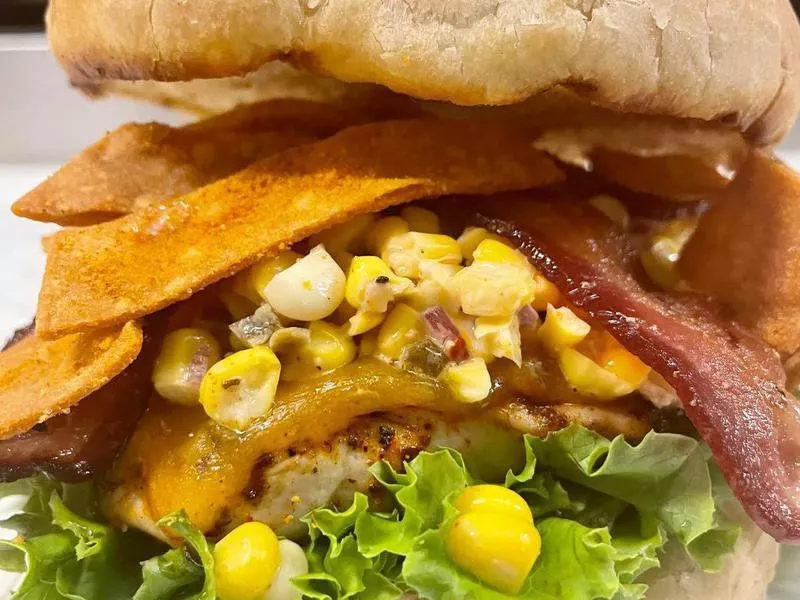 The signature and new-school burgers are truly wacky. There’s one with flaming hot Cheetos inside as well as a dessert burger with chocolate-covered bacon, funnel fries, peanut butter and strawberry jelly.