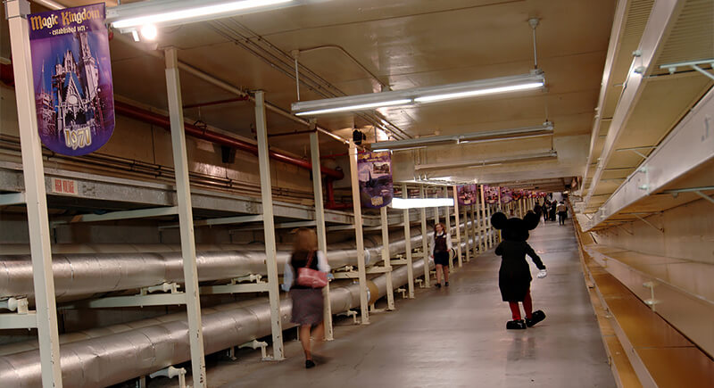 Disney World’s utilidor system runs beneath the Magic Kingdom and keeps the logistical activity, deliveries, costumed cast members, and garbage movement invisible to guests above. While the tunnels are an engineering feat, they’re also not a pleasant place to spend time. Trash moves through the same corridors where staff take breaks and eat meals, and former employees complain about the smell.