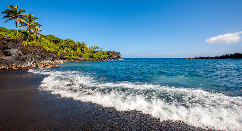 Honokalani Beach turns heads with its jet-black volcanic sand and deep blue water, which feels strikingly intimate. Located within Maui’s lush Waianapanapa State Park, the contrast is mesmerizing. Sea caves, lava cliffs, and misty rain showers add a moody, sensual edge that makes every visit feel cinematic and unforgettable.