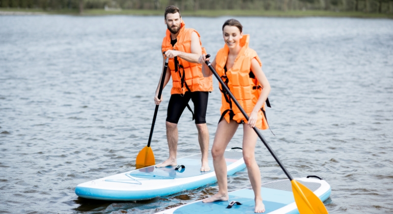 Stand-up paddleboarding places participants above the water while engaging balance and core muscles. Calm lakes, bays, and slow rivers are common entry points. Boards and paddles are widely available for rent. Falling into the water is expected, making swimming ability important.