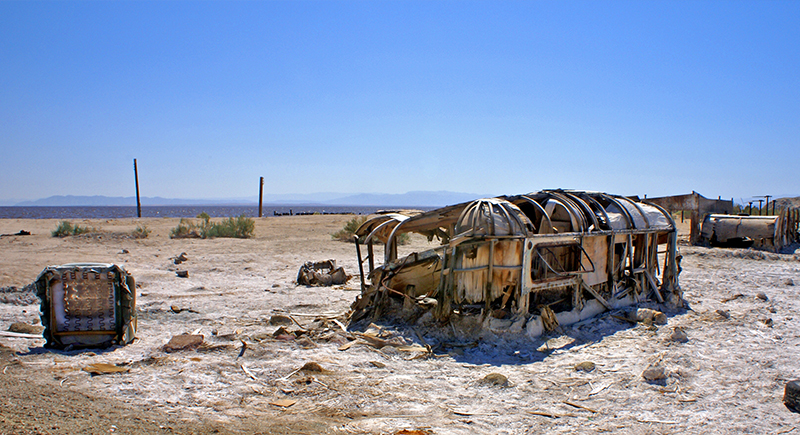 Once a resort on the Salton Sea in the 1950s, Bombay Beach drew vacationers with fishing and motels. Rising salinity and toxic runoff killed fish and drove residents away. Flooding battered homes, leaving trailers and art installations scattered across salt flats, creating a scene frozen in time.