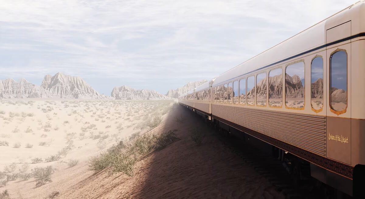 Saudi Arabia’s Dream of the Desert introduces a different kind of luxury train to the region. The route links Riyadh with Qurayyat across more than 800 miles of desert terrain. Interiors draw from Saudi design traditions with a modern finish. Guests can expect guided excursions to heritage sites like AlUla, paired with onboard dining.