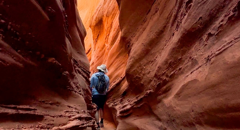 The trail narrows until backpacks need to come off just to squeeze through. Sudden storms from even miles away can cause flash floods that rush through the narrow canyon with no warning. With limited cell service and long distances to emergency help, it’s not a place to get careless with weather forecasts.