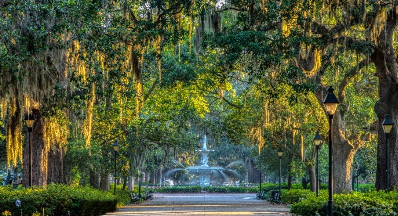 Savannah’s original colonial layout laid out 22 squares across streets like Bull and Congress, each designed as shared green space and social anchor in the heart of town. These range from Johnson Square’s historic monuments to the restored Ellis Square at the City Market.