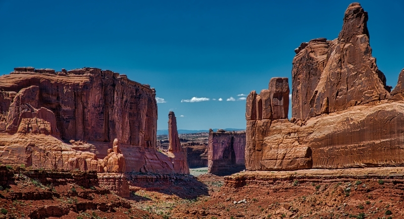 Moab is in eastern Utah, surrounded by striking red sandstone formations. Just outside town, Arches National Park protects more than 2,000 named natural arches. Some trails are short and easy to reach. The Windows Loop is about a mile round trip and brings you close to North and South Window Arches from a nearby parking area. Longer hikes, such as the Devil’s Garden trail, lead to larger formations, including Landscape Arch and Double O Arch.