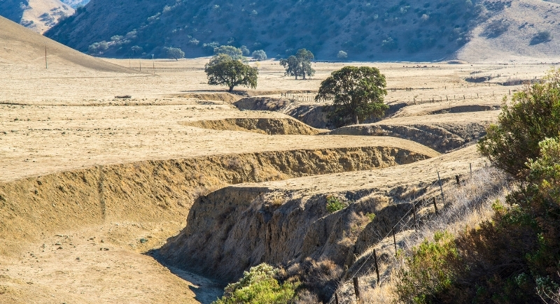 One of the clearest views of plate movement on Earth appears at the Carrizo Plain, where the San Andreas Fault cuts straight across open grassland. This section of the fault shows visible offsets where the Pacific Plate and North American Plate slide past each other. The plain is about 2,200 feet above sea level and receives roughly 9 inches of rain per year. Soda Lake collects runoff in the center of this enclosed basin.
