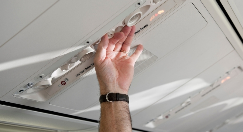 Instead of turning it off or letting it blast your face, aim the airflow just in front of your head at a medium strength. This helps push away particles that might float into your space. The filtered air on planes is generally clean, but that extra airflow can reduce your chance of inhaling something unwelcome.