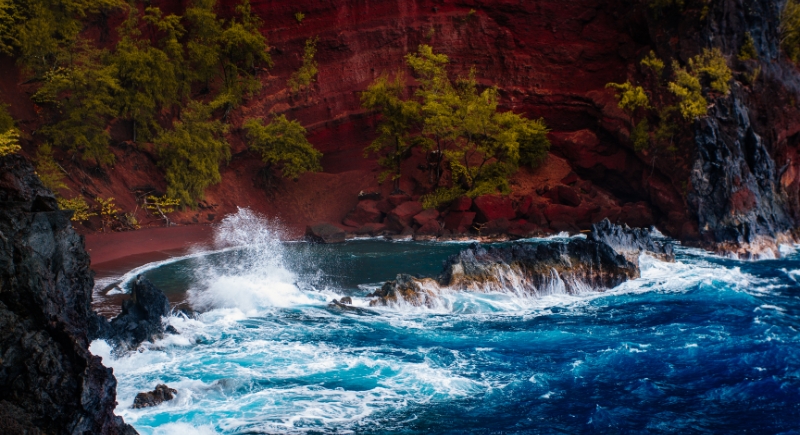 This narrow strip of beach in Maui wears a red tone thanks to the crumbling walls of the nearby cinder cone. The rock here is rich in iron, which oxidizes and mixes with the surrounding sand. The beach is partially protected by a natural lava rock barrier, but access is challenging and requires a steep, unmaintained trail.
