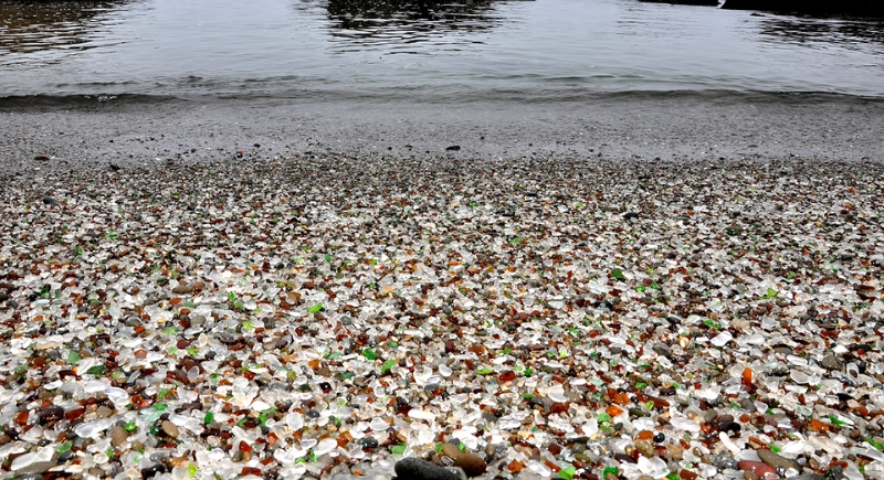 Glass Beach, located near Fort Bragg, was used as a dumping ground from the early 1900s until the late 1960s. Decades of wave action broke and polished the discarded glass into smooth, multicolored fragments. Today, the sand consists of rounded pieces of sea glass mixed with natural sediment.