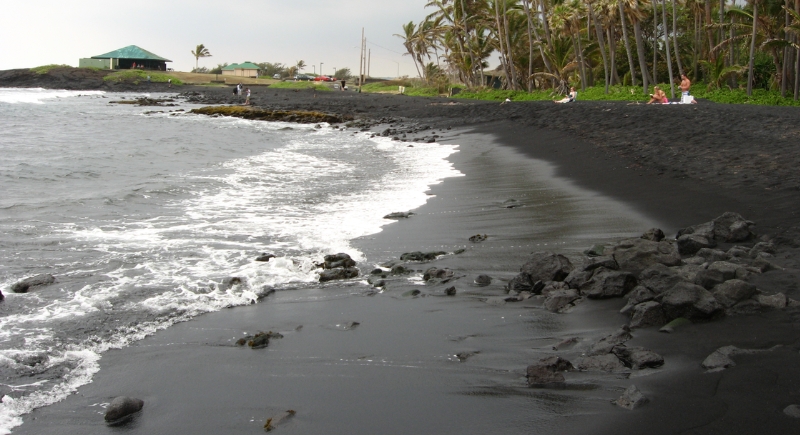 When lava cools rapidly upon hitting the ocean, it fractures into small, sharp fragments. At Punaluʻu Beach, these pieces collect into a beach of jet-black sand. The area is also known for its green sea turtles, which are frequently seen sunning themselves on the dark shoreline.