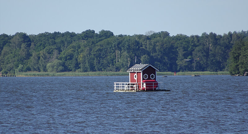 Utter Inn is a floating art installation by artist Mikael Genberg on Lake Mälaren near Västerås, Sweden. The structure includes a small red cabin above water and a bedroom located 3 meters below the surface, with panoramic underwater windows. The property is accessible by boat and offers complete seclusion.