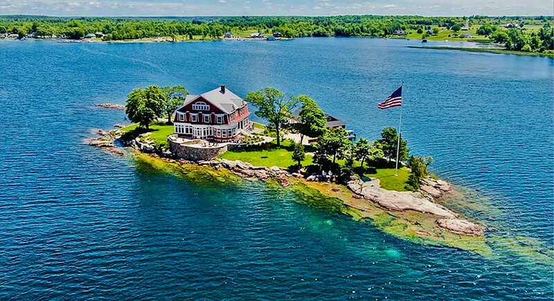 Watch Island is situated in the Thousand Islands region of the St. Lawrence River near Clayton, New York. It features a lodge-style house with a private dock, gardens, and water access. The island accommodates families or groups and is accessible by a short boat ride from the mainland.