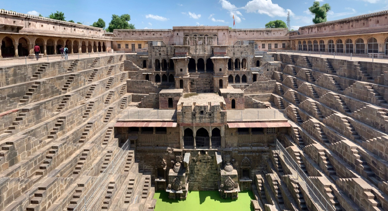 Stepwells across Rajasthan once stored monsoon water for dry months. The most striking, Chand Baori in Abhaneri, drops nearly 100 feet through 3,500 precise stone steps. Built over a millennium ago, it remains a study in symmetry and survival, illustrating how design served both function and community life.