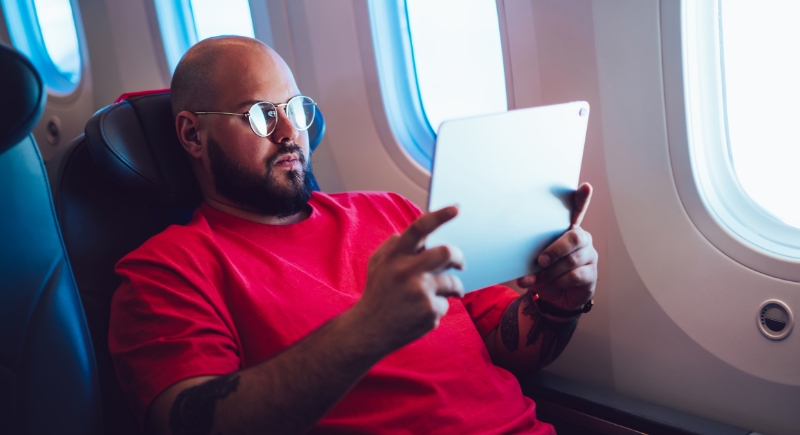 Don’t count on the seatback screen. It may freeze, glitch, or offer limited options. Download a few shows, podcasts, or audiobooks before your flight to keep you entertained during your travel. Podcasts use less battery and make a good choice when you want to rest without looking at a screen.