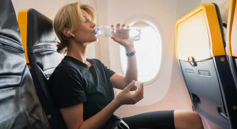 Cabin air is dry enough to dry out your eyes, skin, and throat in just a few hours. Bringing a refillable bottle helps you sip steadily throughout the flight, rather than waiting for water cups every few hours. Drink before you feel thirsty to avoid fatigue or headaches later.