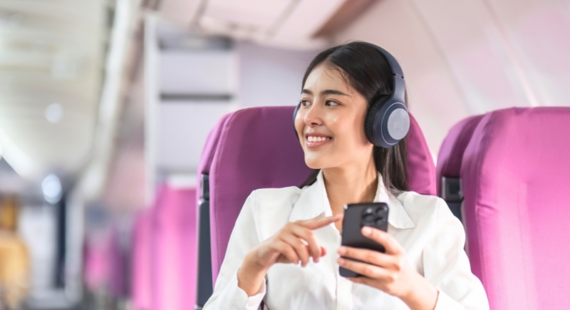 Flights often come with disruptions; even a few quiet minutes of music or breathing can help you stay centered. Having music, a breathing app, or anything else that calms your system makes the hours pass more gently. Headphones that mute some of the outside buzz also go a long way.
