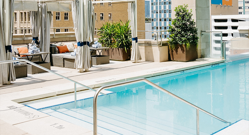 The Joule’s cantilevered rooftop pool is one of Dallas’ most photographed hotel features. Extending eight feet beyond the building, its glass wall creates the illusion of floating above Main Street. Access is exclusive to guests, offering skyline views, loungers, and poolside service that turn every dip into an unforgettable moment.