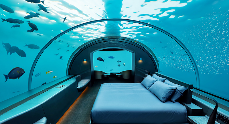 The Muraka is an underwater luxury residence with a bedroom submerged nearly 16 feet below the Indian Ocean. Guests enjoy floor-to-ceiling marine views, a private chef, a personal butler, and speedboat transfers. Nightly rates reach six figures, making it one of the world’s most exclusive hotel experiences.