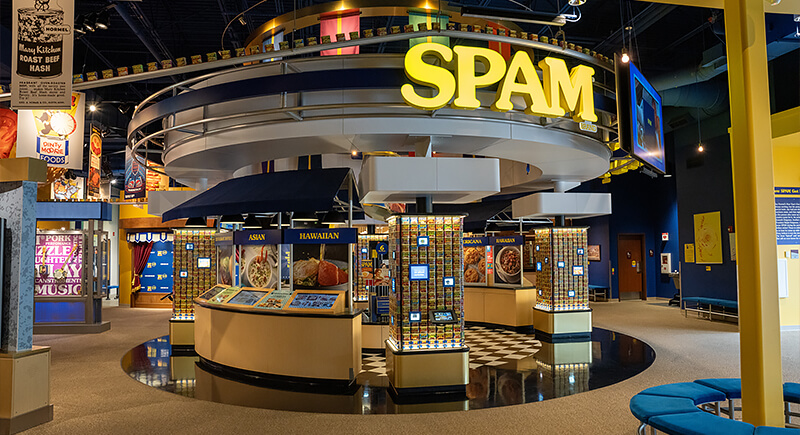 Food historians study Spam as an example of wartime supply influence, and the Spam Museum in Austin, Minnesota, explains how Spam became essential during World War II due to its long shelf life. Interactive exhibits simulate factory assembly lines. Displays show how Spam entered Pacific cuisines through the U.S. military presence.