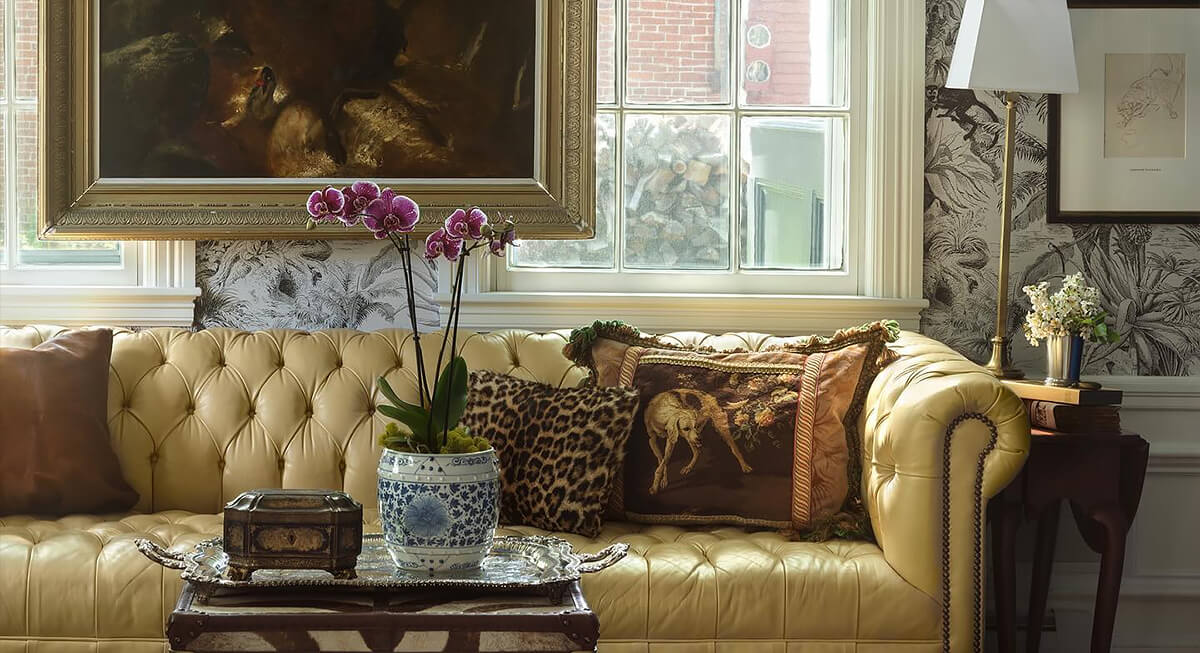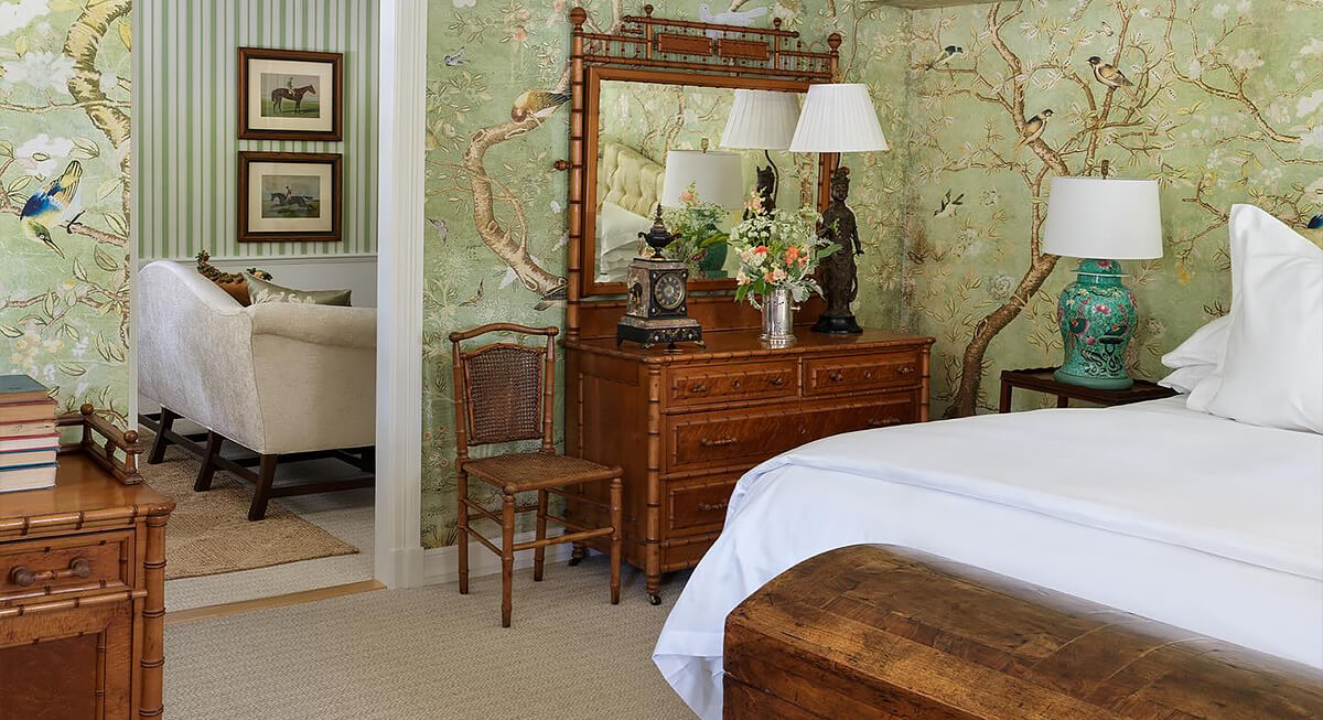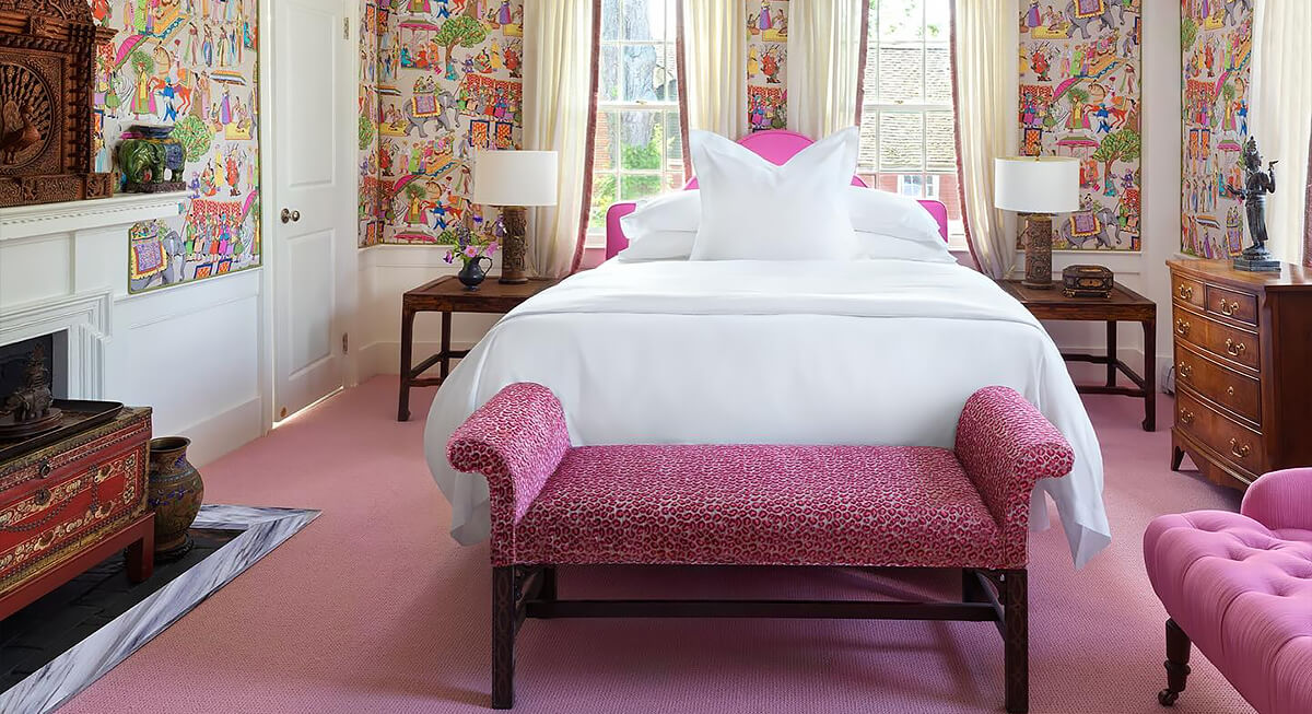 The interiors draw from English country house influences while staying rooted in New England. Bold patterns, layered textures, and unexpected details appear across the property. It feels curated, with each room carrying its own identity.