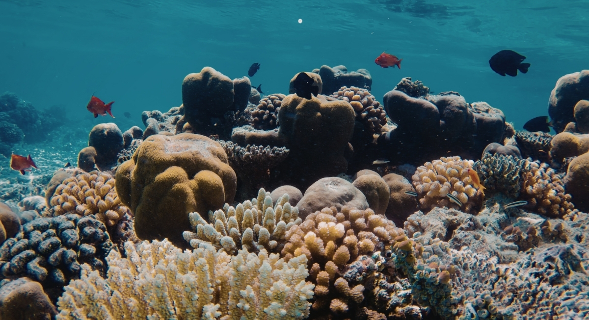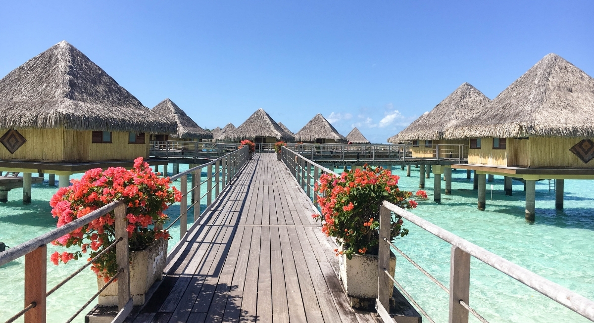 Sea turtles, coral formations, and the Tahitian gardenia are visible throughout the patterns. These elements reflect the surrounding lagoon and plant life that define the resort’s environment. It reads as a visual summary of daily life around the island.