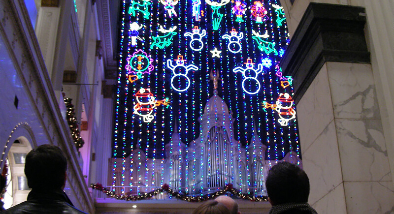 The Wanamaker Light Show has been part of Philadelphia’s holidays since 1956. Inside the rotunda, snowmen and toy soldiers appear in lights, set to music from the Wanamaker Grand Organ, the largest functioning pipe organ in the world. Even with Macy’s closing in 2025, the tradition continues.