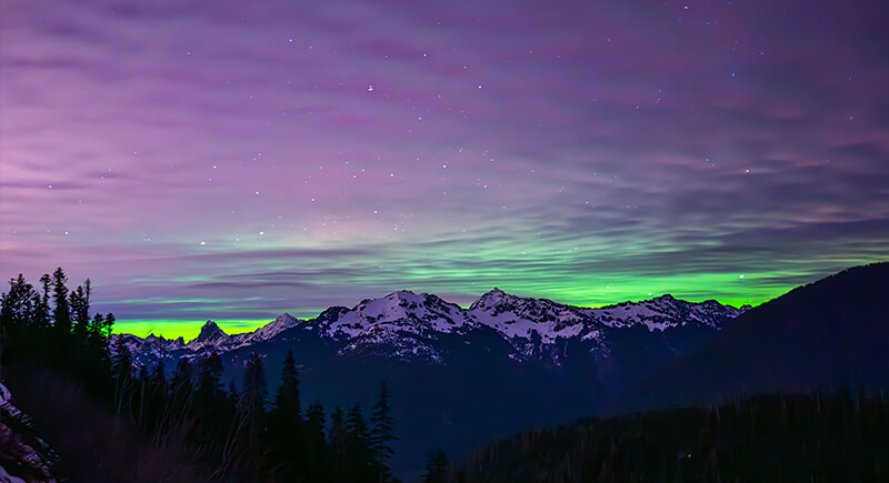 Auroras don’t hit the Pacific Northwest as often, but the Cascade range can get lucky during big space weather events. North Cascades National Park, in particular, offers altitude, distance from major light sources, and wide views over the valleys. Timing helps: a new moon in February or March paired with a solar storm can turn the mountain skies electric.