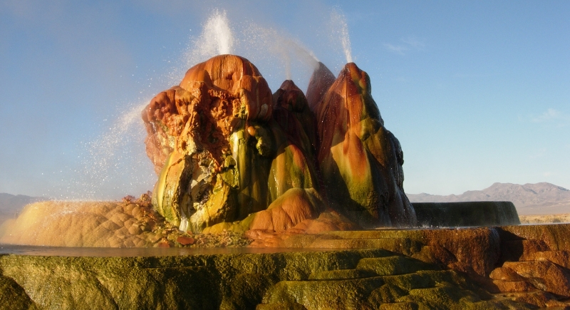 Fly Geyser started forming after a failed 1960s drilling project hit a geothermal pocket. The unsealed well began spewing minerals, and over time, built colorful, otherworldly formations. Its spiky cones now spray hot water continuously. Algae thrive in the moist heat while creating streaks of red and green across the structure.