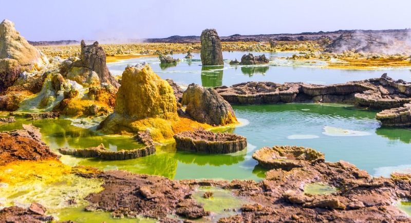 This harsh desert landscape is at the junction of three tectonic plates and feels like a snapshot of early Earth—or a scene from another planet. The area features acid pools, lava lakes, geysers, and sulfur springs. Temperatures can top 120°F. It’s one of the lowest and hottest places on the planet.