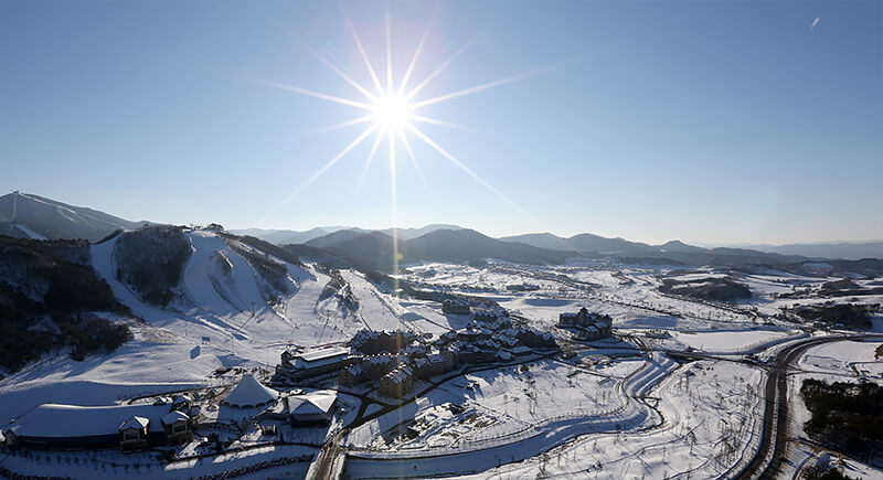This region carries reminders of the 2018 Winter Olympics in its layout, right down to the signage still present around clusters of resorts. The infrastructure lends the area an organized feel that stands out in contrast to the quieter mountain roads nearby. Travelers who step away from the slopes sometimes find themselves on temple grounds, following paths lined with snow-dusted pines.