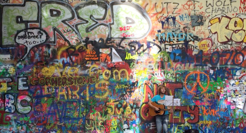 During communist rule, students in Prague began painting messages, Beatles lyrics, and peace signs on a wall near the French Embassy. Authorities painted over them again and again. But each time, new messages returned. The wall became a form of protest. Layers of color and words still cover it, and continue to grow every year.