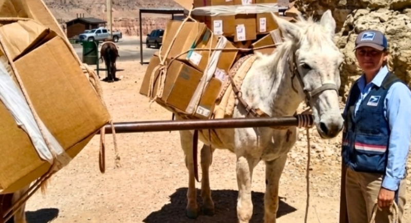 Supai Village, home to the Havasupai people, is at the base of the Grand Canyon and still receives its mail by mule. The 9-mile journey starts at Hualapai Hilltop and takes several hours each way. Each mule carries up to 200 pounds of supplies, and the system runs six days a week.