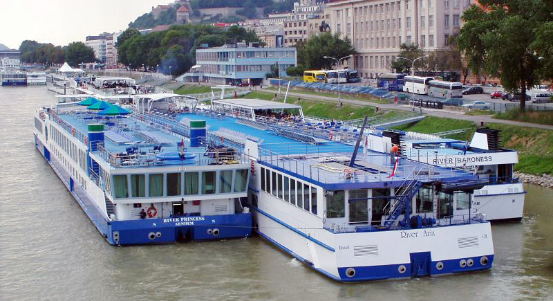 River ports often host several vessels at the same dock. When that happens, ships tie up side by side along the riverbank. Passengers from the outer vessels must walk across the rooftop decks of neighboring ships to reach the pier. Crew members usually guide travelers across the gangways to ensure that no one boards the wrong vessel.