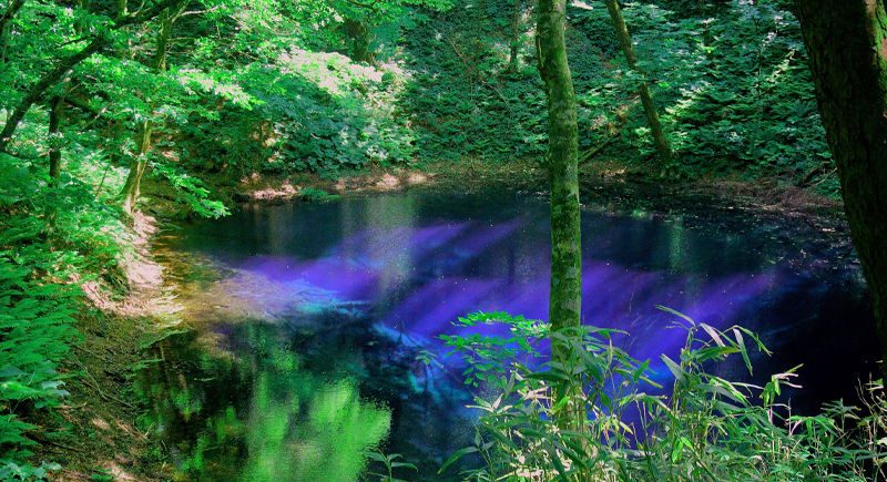 A blue pond in the middle of a beech forest might sound exaggerated, but Aoike really is that color. The pond appears ink-blue due to its clarity, depth, and how light scatters within the water. The trails between the 33 lakes are flat and usually very quiet.