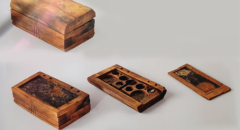 This wooden notebook from a Byzantine wreck looks like an ancestor of the modern iPad. The device features five stacked panels coated in wax for writing notes. It also includes a sliding compartment that likely held small weights used in testing precious metals. Different theories exist to explain its use, and archaeologists believe it was a multifunctional merchant tool in the Byzantine trading world.