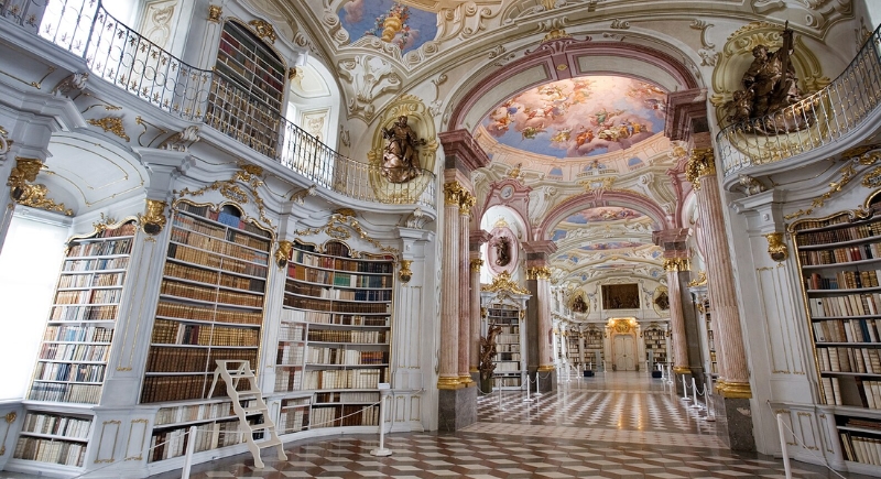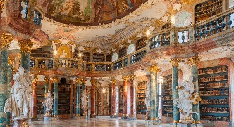 Access comes through a ticketed visit, though the stop itself is brief and carefully contained. Pastel columns, gold detailing, and Januarius Zick’s ceiling paintings draw attention upward more than toward the shelves. Roughly 15,000 theology and philosophy volumes remain in place. The guided path keeps things orderly.