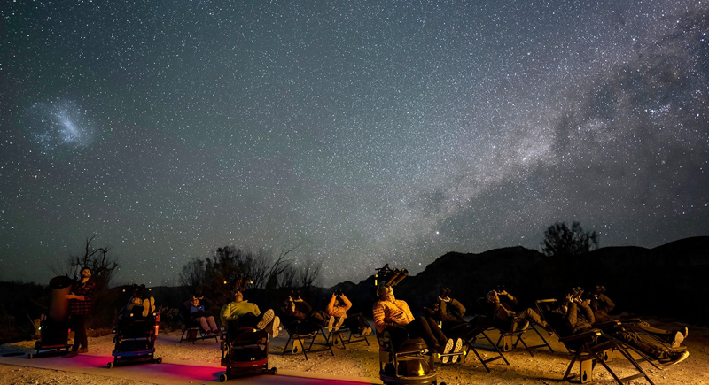 Resident astronomers guide visitors through highlights of the Southern Hemisphere, including the Southern Cross constellation, the Magellanic Clouds, and the Carina Nebula. A popular overnight activity called the Ridgetop Sleepout places visitors on elevated terrain where the Milky Way appears especially sharp against the dark desert sky.