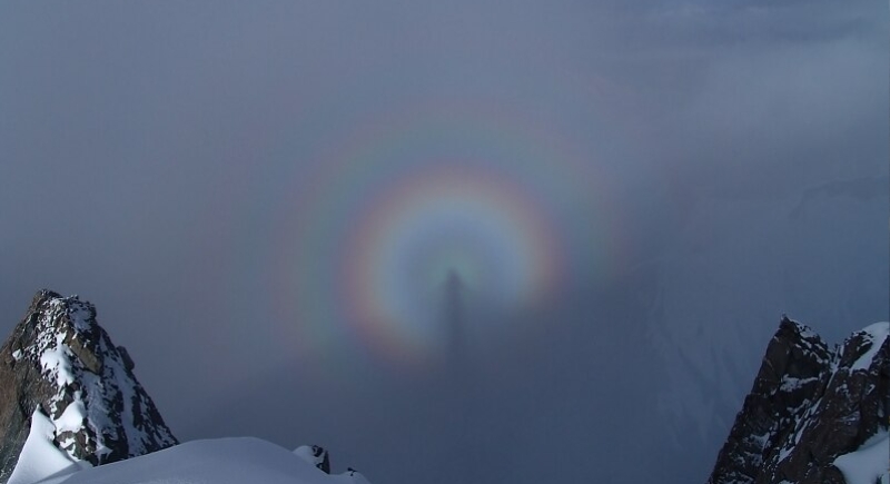 The phenomenon is called the Brocken Spectre. It shows up at high elevation during specific light and weather conditions. The basic factors stay consistent and include low sun, mist or cloud cover below the observer, and a clear line of light aimed forward. When those pieces align, a large shadow appears projected onto the cloud layer, often ringed by faint rainbow colors.
