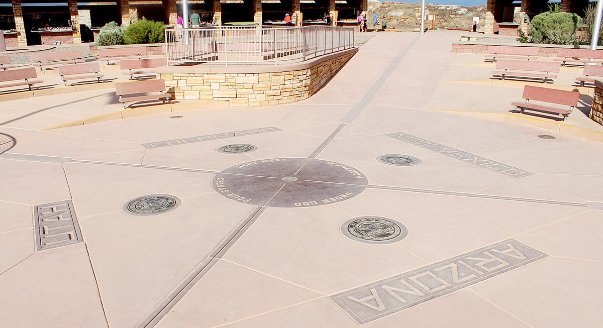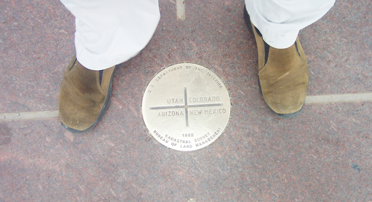 Visitors step onto a bronze disk set into the ground, placing hands and feet across the quadrants to claim all four states at once. The layout is direct and easy to understand, which is part of why the site draws so much attention. It turns a map into something physical without much explanation.