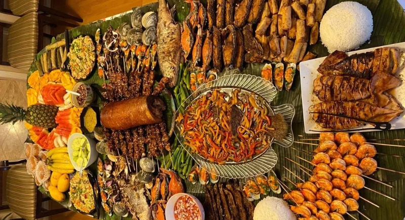 The boodle fight, originally a military dining tradition in the Philippines, is now a communal feast. Dishes like grilled fish, pork, vegetables, and rice are spread over banana leaves. Diners eat with their hands, standing around the table. For travelers, this style of eating often becomes one of the most welcoming and memorable parts of visiting the Philippines.
