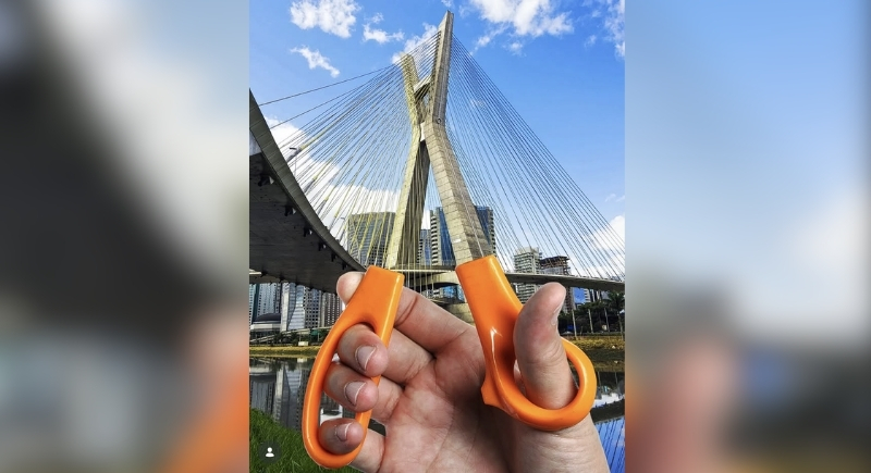 Cable-stayed bridges are basically lines waiting to be cut. By placing scissors at the right angle, the cables seem like taut string, and the tower becomes the ‘thing’ being trimmed. The bright sky helps the cables stand out, and the orange handles add a pop that tells viewers exactly where to look.
