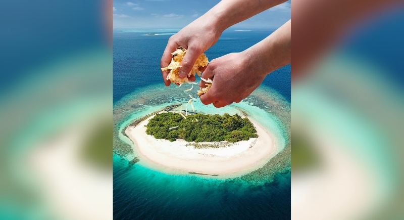 This shot sells the idea that a whole island can fit between two hands. The turquoise water and clean horizon keep the scale believable, while the falling shreds of cheese add motion that makes the illusion feel spontaneous. It’s a classic Suíssas move… take a huge landscape, then shrink it into something that belongs in a kitchen.