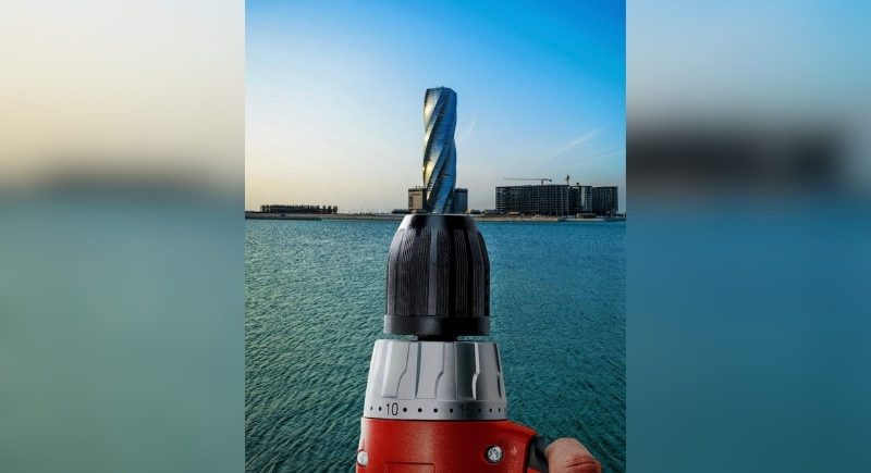 Some buildings practically beg to be turned into tools. Take this, for example: the twisting tower mirrors a drill bit’s spiral, and the foreground drill completes the joke. As you keep your focus on the spiral alignment, it looks complicated until you notice the shape match.