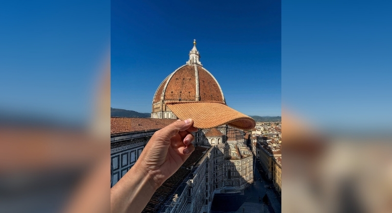 Color matching convinces everyone through the visor’s warm tone, which blends with the terracotta roof. If you don’t believe in planning, this shot shows how it matters. The hand position is casual, but the alignment has to be precise to keep the curve believable.