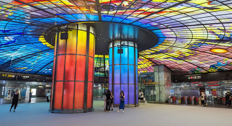 The Dome of Light installation at this Taiwanese station holds the record for the world’s largest glass artwork. Italian artist Narcissus Quagliata spent years creating the kaleidoscope effect that greets commuters with thousands of panels covering themes of water, earth, light, and fire. Japanese architect Shin Takamatsu designed the overall structure, which represents two hands in prayer. The fares vary by distance but start at around 20 NT$ (approximately $0.63).