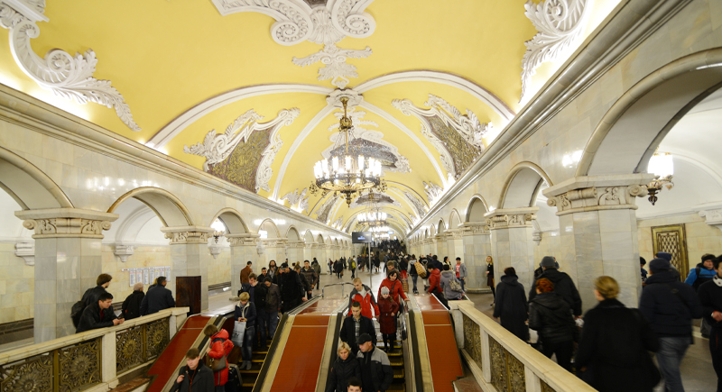 Komsomolskaya makes a strong impression the moment you step inside. Chandeliers hang from high ceilings, arches stretch across the platforms, and large mosaics fill the space with scenes from Soviet history. Yellow marble columns and detailed ornamentation turn what is one of Moscow’s busiest stations into something closer to a grand public hall. Despite the scale and decoration, it still functions as a major transit hub. A ride using a Troika card costs about 42 rubles, roughly $0.50.
