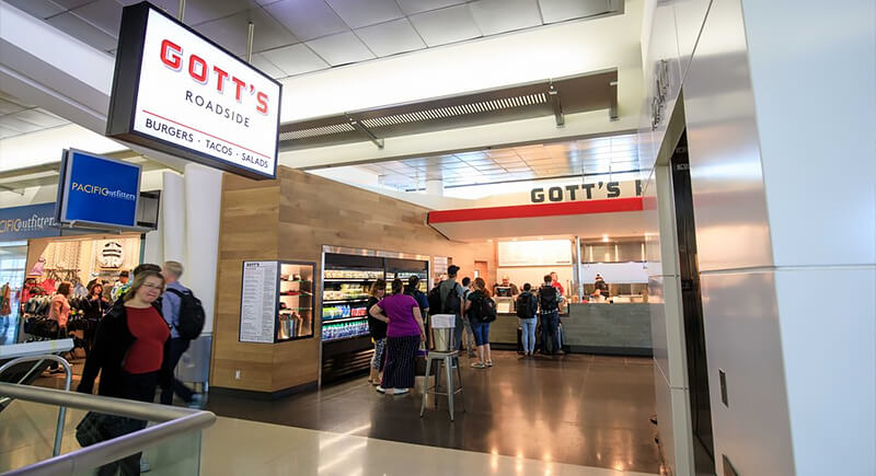 Gott’s brings a bit of Napa Valley comfort to the airport. The veggie cheeseburger and house lemonade are local favorites, and even the fries and jalapeño pickles are made fresh. It’s tucked inside Terminal A, but regular travelers know the detour is worth it.